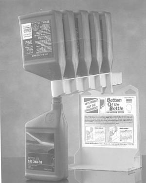 It consists of a plastic collection unit that holds five 1-qt. bottles upside down so that every last ounce of hard-to-get oil drains out. The oil runs down a channel to another quart bottle positioned below.