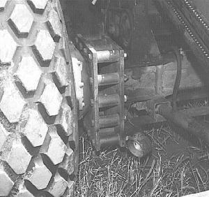 Roger also retrofitted the drive wheels on his 7700 with a pair of Alliance 12-ply knobby tires from Harry's Farm Tire Service (Jackson St. Place, Wheatland, Iowa 52777; ph 319 374-1253). "The reason for doing so was to reduce lug tracks from the combine and, thus, cut down on vibration in the cab of my 4640 when V-ripping bean ground after I combine," he says.