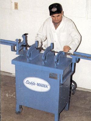 Sickle Master Machine FARM SHOP Tools 23-3-34 Due to age, I'm looking for a manufacturer and distributor to take over production and sales of our Sickle Master machine. We have built and sold 248 Sickle Masters to machine shops and farmers who use it to rebuild and repair sickles on swathers, combines and mowers. It makes it easy to restore a worn and damaged sickle to like-new condition for about half the cost of a new one. It includes a hydraulic shear to cut off the old knife, and a press that takes out the old rivets. It then sets new rivets with 2,200 lbs. of hydraulic pressure so there's no bar distortion.