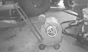 Clohassey used a 3-ft. wide, 2-ft. high fan that's driven by a 1/4 hp electric motor. He mounted the fan on an angle iron frame equipped with four lawn mower wheels and a push handle. A metal deflector diverts air out the front side of the fan and down toward the floor.