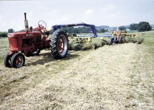 "It lets me rake 24 ft. at a time without having to spend a lot of money on a new commercial V-rake," says Spoerl. "I use my International H tractor to pull it and can rake 100 acres on one tank of gas. I can make either single or double windrows by simply changing the position of the rear rake.