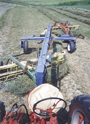 The home-built hitch is used to pull two rakes - a 9-ft. Deere 670 and a New Holland 258 equipped with dolly wheels. The rear rake can be pulled on either side in the field or at the center for transport.
