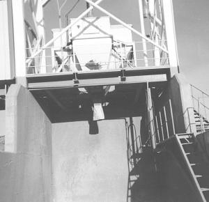 It consists of a large I-beam frame mounted above 16-ft. high, 1-ft. thick concrete walls set 12 ft. apart. A large hopper bin on top holds up to 50 tons of dry cement. Cement gravity feeds out the bin through a long rubber boot into a compartment in a steel tank that mounts below the bin. A second compartment holds sand and gravel, which is loaded into the bin by a payloader that drives up a dirt ramp.