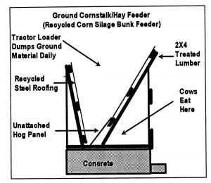 The bunk extends out from a feed room next to a pair of silos. It's 4 ft. high on one side and 6 ft. high on the other side. The 6-ft. high side slopes down at an angle and is open at the bottom where cows feed. The opening is partially covered by a series of hog fence panels which extend about 1 ft. above the floor of the bunk. Cows reach under the panels to eat the feed. A series of metal sheets placed against the "short" side of the bunk extend down at a 45 degree angle to keep feed flowing toward the opening.