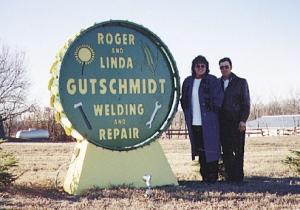 About 1 1/2 years ago I came up with this colorful sign to advertise my farm repair business. It's located next to my house and close to a major highway so a lot of people see it. I get a lot of compliments on it. The sign is painted Deere green and yellow and is about 10 ft. high. To make it I mounted an 8-ft. dia., 18-in. wide wheel rim - off an old steam engine - on top of a 2-ft. high steel base. The base is hollow and filled with rocks to hold the sign in place. It rests on top of railroad ties and is anchored by 4-ft. long steel rods that extend through the ties and into the ground. The wheel rim is covered on one side by two steel plates - a green one in front that has letters and decorative objects cut out of it, and a solid yellow one behind it. I had the letters cut out by a local shop which used a laser cutter to do the job. I used my own plasma cutter to cut out the decorative objects which include a sunflower, wheat stalk, hammer, and wrench. A floodlight that runs off a timer shines up toward the wheel at night. The yellow color really stands out in the darkness. At Christmas I decorate the wheel rim with lights to make it look like the wheel is turning. One advantage of cutting out the letters is that it eliminates the need to repaint anything. (Roger Gutschmidt, 6651 Hwy. 56, Gackle, N. Dak. 58442 ph 701 698-2310)