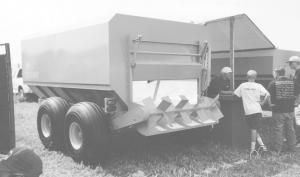 A pair of hydraulic cylinders are used to raise the 12-ft. long, 8-ft. wide box. As it's raised, manure flows by gravity out the back into a series of pto-driven, 23-in. dia. flails. The flails extend 65 in. across the back and spread manure 18 ft. wide.