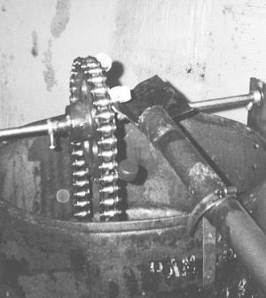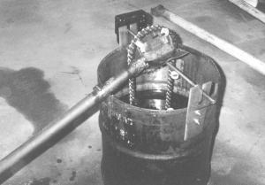 He started with a 30-gal. drum which is filled with oil. On top of the drum he mounted a 1/2-in. shaft with bearings on either end mounted on wood blocks. At the center of the shaft is a 6-in. roller chain sprocket. A loop of roller chain hangs from the sprocket, with the lower end dangling loosely in the oil. Next, Bennett attached several caps from 20-oz. pop bottles to the chain.