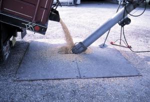 Here's an idea I came across in my travels. It's an "emergency" hopper for a bin-fill auger. You just dig a hole in the ground for the end of the auger, and then put a piece of plywood on either side of the hole. Just cut a half circle in the side of both pieces of plywood to fit around the end of the auger. Then drop the grain onto the plywood. (C.F. Marley, Nokomis, Ill.)
