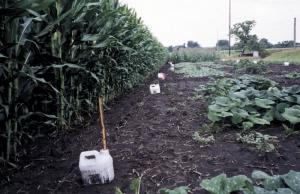 It consists of 2 1/2-gal. plastic herbicide jugs with the bottom one third of each jug cut off. He spaces the jugs evenly around the garden and drives a stake through the top opening and down through the bottom of each jug to hold them in place.