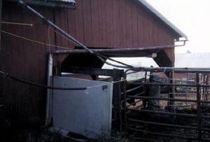 Feed Bins Made Out Of Old Hog Feeders LIVESTOCK Feeding Equipment 23-6-34 I've made several feed bins out of old hog feeders. I unbolt the feed panels from below the funnel portion of the feeder. Then I install a wooden floor withan opening at the middle where I put in a slide gate and spout. I used an old aluminum storm window frame to make the track for the slide gate. I also bolt steel legs onto the sides of the feeder and weld disc blades onto the bottoms for stability. I use the bins to fill baskets and 5-gal. buckets. The photo shows two feed bins, which each hold about 40 bu. I keep soybean meal in one and calf feed in the other. I even made an 80-bu. model by removing the funnel portion from one feeder and bolting it on top of another feeder.