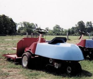 I've had a lot of fun with my home-built, zero turn riding mower which has an up-front deck that can be replaced with a 4-wheeled "cargo caddy". My mower has features that make it work better than any commercial riding mower on the market. It's simple, compact, and very durable. The mulcher-type, rear discharge contoured deck is supported by hidden caster wheels and floats up and down over uneven terrain. However, regardless of the deck's angle, the drive belt to it stays exactly at the same tension at all times. The deck has a recessed yoke in front that lets you cut up close to bushes and shrubs. The deck is secured by a pair of push rods.