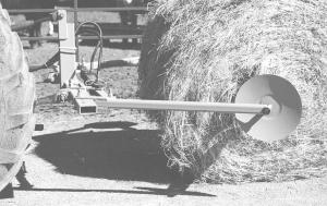 The two pivoting side arms are made from 2-in. sq. steel tubing. They're opened and closed by a hydraulic cylinder positioned across the top of the main toolbar. Each side arm is fitted with a 12-in. rotating spear mounted on bearings. The spears fit into the center of the bale. Discs welded to the base of each spear keep the bales from rubbing on the side arms as they unroll.