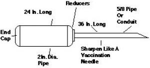 He simply sharpens a 36-in. long piece of 5/8-in. dia. electric conduit and then mounts it on the end of a 2-ft. long piece of 2-in. dia. pipe. The larger pipe has a screw-off cap on the end.