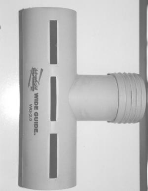 The 6-in. long, T-shaped, PVC unit clamps onto the end of the sprayer's existing foam drop hose and has three 1 1/4-in. long slots lined up in a row. The foam squeezes out of the slots in three flat, narrow ribbons that cover a total width of about 6 in.