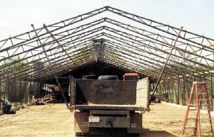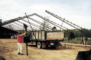Here's a pretty simple idea that works well for us. We tear down chicken houses and we added these booms to the sides of our Ford truck to take down the trusses. They bolt to the frame and support the truss while we disconnect it at the ends. They simply hook over the side of the truck bed and telescope out as needed. (Gordon Brevik, 193 Polk 659, Mena, Ark. 71953 ph 501 394-5599)