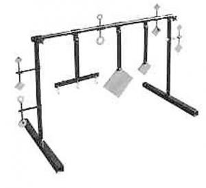 The "Blast-O-Rama" is made from steel tubing and measures about 3 1/2 ft. high and 5 ft. wide. The frame supports a variety of swingers and spinners that mount on the horizontal main frame as well as on the legs. The steel targets are thick enough that when bullets hit them they simply swing up out of the way or spin completely around.