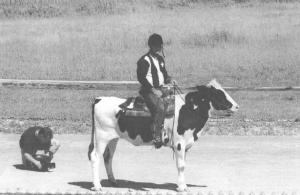 "Cow jockey" Brian D. Nielsen of Mason, Mich., rode Taffy, a three-year-old Holstein cow, to an exciting finish. Nielsen and his "steed" completed the one mile race in eight minutes, 55 seconds, outdistancing five other "racecows".
