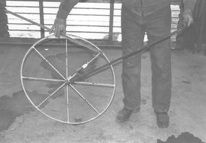 They used 8 ft. of 1/2-in. dia. rebar to make the wheel, welding 1/4-in. dia. steel spokes 1 ft. long to the center hub made from a short piece of pipe. A toggle counter mounts on the steel handle that's made from 1/2-in. dia. steel tubing. Plastic from an antifreeze bottle was used to make a flipper that mounts on an arm at the end of the counter. Every time the flipper contacts a spoke it makes a click on the counter, indicating 1 ft. of travel.