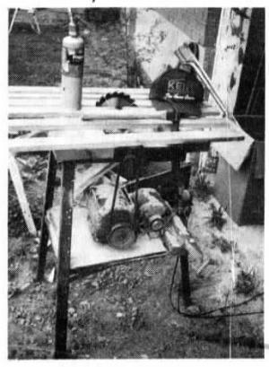 I think FARM SHOW readers might be interested in my "made it myself" table saw. It cost only a fraction of the price of a commercial machine and works very well. I made a stand out of angle iron and mounted a used 1/3-hp. Jet Pump electric motor on a shelf underneath. I made the table top itself out of 2 by 8-in. boards with 1 by 2-in. boards running across them. A "T-square" and "rip fence", also made out of 1-in. boards, fit into the spaces between the boards. A carbide-tipped 7 1/2 in. ultra-thin blade mounts on a blade arbor and two brass roller bearing bushings that I fashioned out of an old grinder. There's a small grinder motor next to the saw motor.