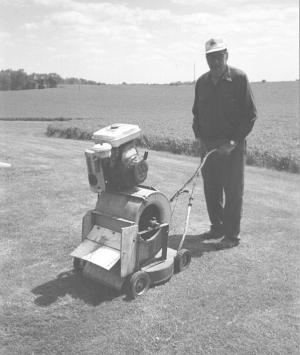 "The 7 hp engine came off my brother's straw chopper. I used a big engine because it has to start under load and there's no clutch. To mount the engine I used the same mounting bracket that originally supported the fan's electric motor. I made an angle iron frame and used it to bolt the fan to the mower frame."