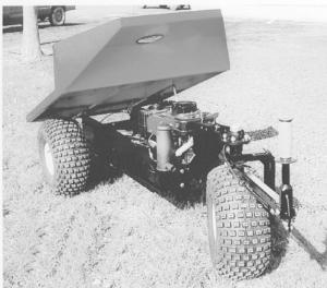 There's no seat on the "Agritruck". You control the self-propelled 3-wheeled cart with a handle on front. It's powered by a 10 hp. Tecumseh electric-start engine driving a hydraulic pump that provides variable-speed hydriostatic power. The front wheel casters for easy steering.