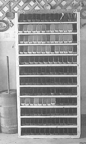 "I built a shelf to hold the bottles, sizing it so they fit in tightly because the bottles have thin sides and they'll stand up better. The drawing shows the best way to cut the bottles. It keeps them as sturdy as possible."