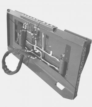 The "Quick Change 2000" is a totally enclosed unit that measures 45 1/2 in. long and 18 1/2 in. high. It's only 2 3/4 in. deep. A pair of spring-loaded pins are operated by hydraulic cylinders. The pins are engaged or disengaged by flipping an electronic solenoid switch in the cab. Because the pins are spring-loaded, they will remain in place even if the skid loader's hydraulic system fails. As a safety precaution, a pair of red metal tabs pop up to warn when the pins are disengaged.