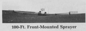 "Two 250 gal. Demco tanks are mounted on the front of a 2470 Case 4-wheel drive tractor. I built the booms from 2 1/2-in. steel pipe in a special truss configuration. Stainless steel nozzles along the bottom of the boom are fed chemical through 1 1/4-in. plastic pipe. The booms are hinged at each set of tandem caster wheels as well as at the end of each tank. A 3-in. hydraulic ram on either side lifts each boom. The outer 10 ft. of each end is swivel mounted and spring tensioned to allow for movement in case of misjudgement and to fold the segments up for transport.