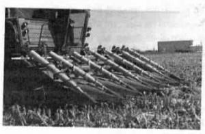 Roll-A Cone Dividers For Down Corn COMBINES Down Corn 19-5-38 Anyone with down corn problems in the fall will want to keep in mind our tried and proven Roll-A-Cone dividers which have been on the market for 20 years. The cones mount on each snout and can be hydraulically or mechanically driven (a sprocket mounted on the end of the header's cross auger chain-drives the cones). The outside cones divide the outer rows and gently roll down corn up the dividers while all the other cones lift the crop up and into the cross auger. The cones fit the latest model combines. They're simple and lightweight and won't interfere with normal operation. They sell for $400 per row. (Billie Byrd, Roll-ACone, Rt. 2, Box 25, Tulia, Texas 79088 ph 806 668-4722)