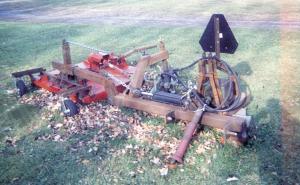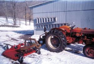 The mower is pto-driven off a right angle gearbox that Finch salvaged from an old Deere corn chopper. He also used some of the chopper's driveshafts and universal joints. He had to rotate the gearbox on the Bush Hog 90 degrees.