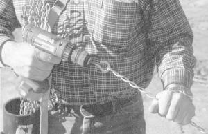 He made a little device for his cordless drill that he calls the "EZ-Zinger" and it has made the task easier and faster. To speed the work even further, he made a quiver/holster that holds a quantity of wire fence stays and his cordless drill.