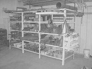 Cary Urka, Brethren, Mich.: "I bought this steel rack at an auction for $50, painted it, and bolted it to my shop floor. The rack measures 12 ft. wide, 3 ft. deep, and 7 ft. high. Works great for storing miscellaneous objects, pieces of steel, etc. Bins on one end of the rack are used to store pipe fittings. I mounted a punching bag on the rack for occasional workouts.