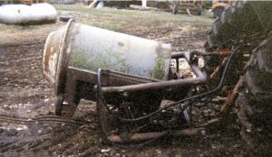 I converted an old 10,000-volt electric transformer into a 3-pt. mounted, hydraulic-operated cement mixer. I got the transformer free from the power company where I work. I cut it up to make a drum and then mounted a ball fin inside it that I made out of an old grinder. An orbit motor is used to chain-drive a rubber wheel that rotates the drum. The entire unit mounts on a homemade steel pipe frame. A pair of hydraulic cylinders are used to tilt the mixer up or down in order to dump the material.