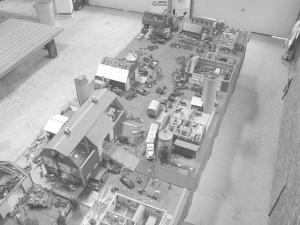 The mini farm measures 8 by 24 ft. and is displayed atop six sawhorses. It folds in the middle for transport. Numerous working parts all operate electrically using transformers, relays, and time delay relays.