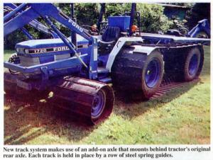 Rubber Track System For Utility Tractors TRACTORS Tires/Wheels 19-5-40 "It has tremendous flotation on soft ground which allows it to go just about anywhere, and the tracks can be quickly removed so you can use the tractor on wheels for other jobs," says retired engineer Chuck Williams of Vancouver, Wash., about the rubber track system he designed for his Ford 1720 37 hp, 4-WD tractor.