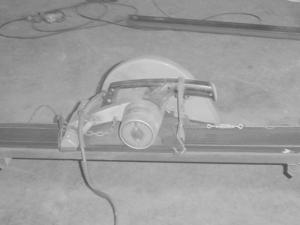 Visser put a roller and a hand crank at each end of the rail and hooked the cable to each side of the saw's slide plate. The winch system moves the saw smoothly from one end of the rail to the other. The operator doesn't have to lean across the plate and pull the saw by hand.