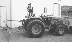 Yancsek, from Helena, Mont., mounted a 2-in. ball on the drawball of his Kioti DK45 to pull with a chain. To make the grader easier to transport, he removed the auger, gearbox and shaft from a posthole auger, and uses the boom to raise and lower the rail. He says it would work on any tractor with a 3 pt.