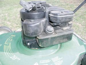 His mower is equipped with a 3 1/2 hp Briggs & Stratton engine. He says the idea won't work on any other kind of engine because there isn't room for a second starter, as the fuel tank gets in the way.