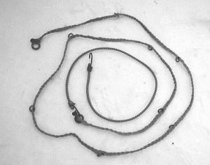A 42-in. length of bungie cord is fitted with a metal hook at each end. One end of the cord is hooked onto a rope with a 1 1/4-in. dia. lock washer attached to it at both ends. Eight 7/8-in. dia. lock washers, pressed flat, are braided into the rope at 12-in. intervals. The rope is 9 ft. long. The result is an elastic cord about 12 1/2 ft. long which can encircle the covered bale and securely hold the plastic bag in place. As the bale gets smaller in diameter, the open hook at the end of the bungie cord can be hooked into any of the small washers along the length of the cord.