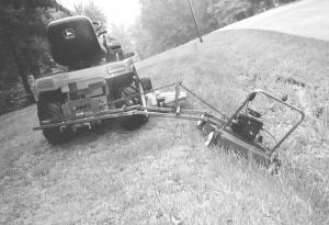Mowing ditches and steep hillsides is no longer a problem for Chris Rahman, Ferdinand, Ind., who made a flexible hitch that mounts on back of his Deere 325 garden tractor. It lets him pull a 22-in. push mower 2 ft. out to the side of his tractor.