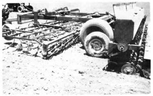 They put on chemicals in the spring with a tandem offset disk with a boom mounted on front of it. To carry chemicals, they reworked a cart that was originally designed as a pusher cart for the front of the tractor. They turned it around and attached it to the back of the disk with rigid steel tubing. The cart is fitted with four wheels, two on each caster mount.