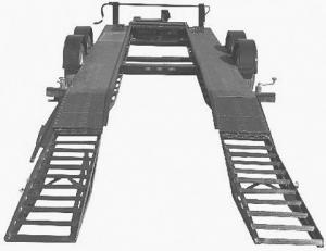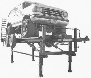 The trailer measures 25 ft. long and has a frame made from 6-in. channel iron, with the space between the frame rails left open leaving room to make repairs to the underside of the raised vehicle. The vehicle is raised by four adjustable lift legs - two on front and two on back. A pair of 3-in. dia. dual action hydraulic cylinders, equipped with safety interlock valves, do the lifting and are operated by a built-in, self-contained 110-volt hydraulic power pack.