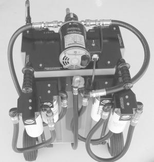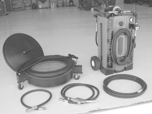 The system also includes a transparent 27-gal. new oil dispensing cart with a light on it for night time work. The cart rides on a pair of 10-in. pneumatic wheels and has a 23-ft. dispensing hose. An electric-driven 3-gal. per minute pump mounts on top of the tank. A 97 percent accurate digital meter measures and dispenses oil from the cart.