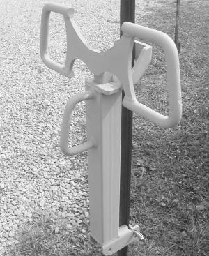 The Post-Mate weighs 28 lbs. and, unlike conventional post drivers, is designed to be used at waist level. A pair of handles drive a square steel tube that fits inside a larger tube. There's a U-shaped bracket at the top of the larger tube and another bracket at the bottom. To attach the unit to the post, you place the top bracket behind the post and then insert a metal pin through the bottom bracket. To pound the post down, you simply lift the handles up about 1 ft. and then let go. The same handles are used to pull the post out.