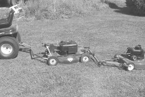 He removed the push handles on both mowers and used 1-in. sq. tubing to weld a hitch that attaches to a 2-pt. drawbar on back of the riding mower. He welded a pair of brackets made from 1-in. tubing on back of the first push mower and attached old garage door hinges to them. The hinges allow the trailing mowers to flex up and down on hills. He also attached a hitch on front of each mower. Each hitch has holes in it, allowing him to vary the cutting width.