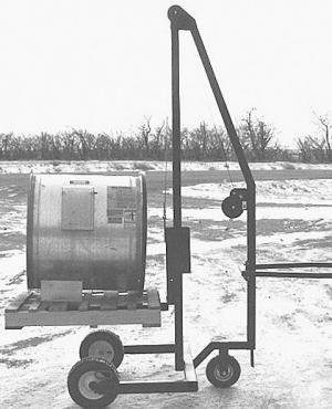 "This makes it easy to use one fan on several bins," says inventor Richard Epp. "It uses a winch to position the fan in place for mounting on a flat or hopper bottom bin. The wheels are big enough to roll easily over rough ground."