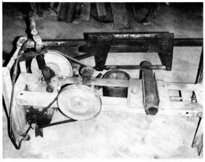 Wiseley also built his own powered hack-saw. It mounts on an angle iron frame and is belt-driven by a 1/4 hp electric motor. An eccentrically-mounted steel rod attached to a pulley drives a frame that holds a standard hacksaw blade. As the pulley turns, the rod pushes the blade back and forth across the object to be cut, which is held in place by a vice.