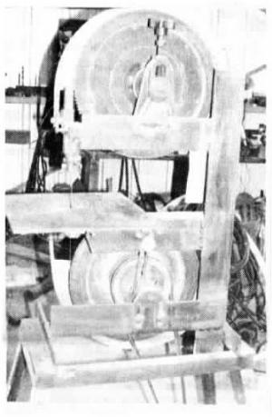 The band saw blade fits around both fly-wheels, which are mounted on an angle iron frame. A 1/4 hp electric motor belt-drives the bottom flywheel which in turn belt-drives the top flywheel. The top fly-wheel is mounted on a radiator fan shaft salvaged from an antique tractor. The bottom flywheel is mounted on a water pump shaft off an old Ford car. Wiseley tightens the blade by turning a crank that raises the top flywheel (the crank was used to tighten the radiator fan belt on the tractor).