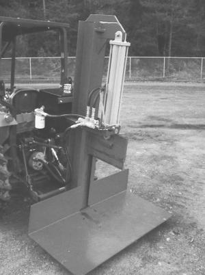 The splitter works vertically and has its own hydraulic reservoir and pto-driven hydraulic pump. A metal splitting platform measures 4 1/2 ft. long by 27 in. wide. The platform hydraulically raises about 2 ft. off the ground. A 4-in. dia., 24-in. stroke hydraulic cylinder attached to a 17-in. long wedge is used to split the log. The operator uses a control lever on the tractor to raise and lower the platform, and another lever on the splitter to operate the cylinder.