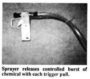 The sprayer operates on a 12-volt battery and dispenses only a preset amount of chemical at each pull of the trigger.